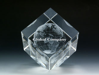 透明度の高いキューブ形のクリスタルガラスの中に、リアル感が出るように凹凸をつけた地球儀を立体彫刻しました。外面レーザー彫刻で1個よりのオリジナル名入れ承ります。グローバル企業向けの記念品に最適です。