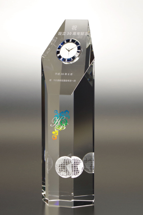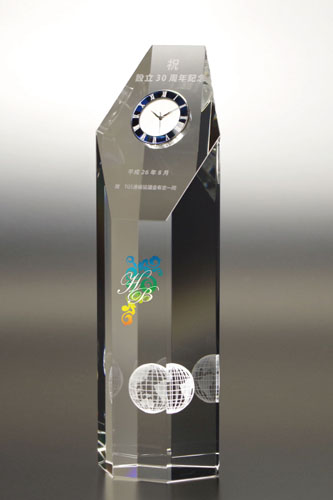 六角柱の上部カット部分に時計を追加したワールドワイドで豪華な逸品です。内部には予め3Dの地球儀が彫刻されていますので、グローバルな事柄の表彰に最適です。