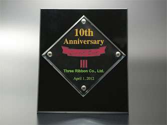 黒い板ガラスに透明なガラスを重ねてビス止めした表彰盾です。背面の支えもガラスを特殊な接着剤でしっかり固定していて安定感は抜群です。