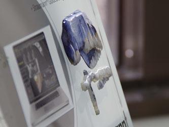 通常のダイレクトプリントと同じくフルカラーで印刷でき、なんと透明度のある立体も可能です。上記のグリーンのインプラントと周囲の飛沫は、透明に透けていてガラスの裏面までが見えています。